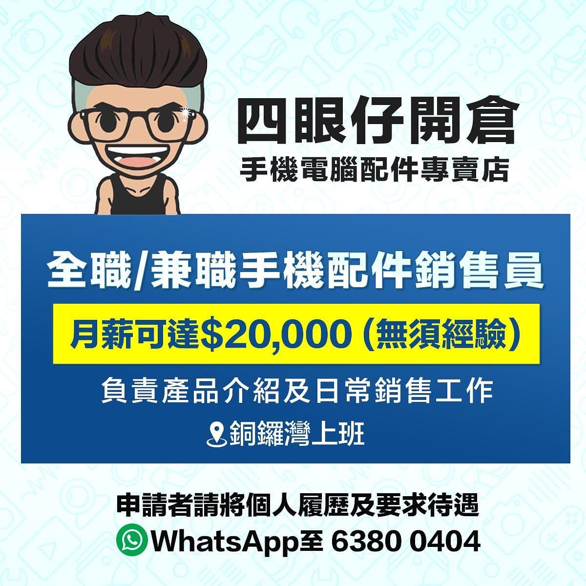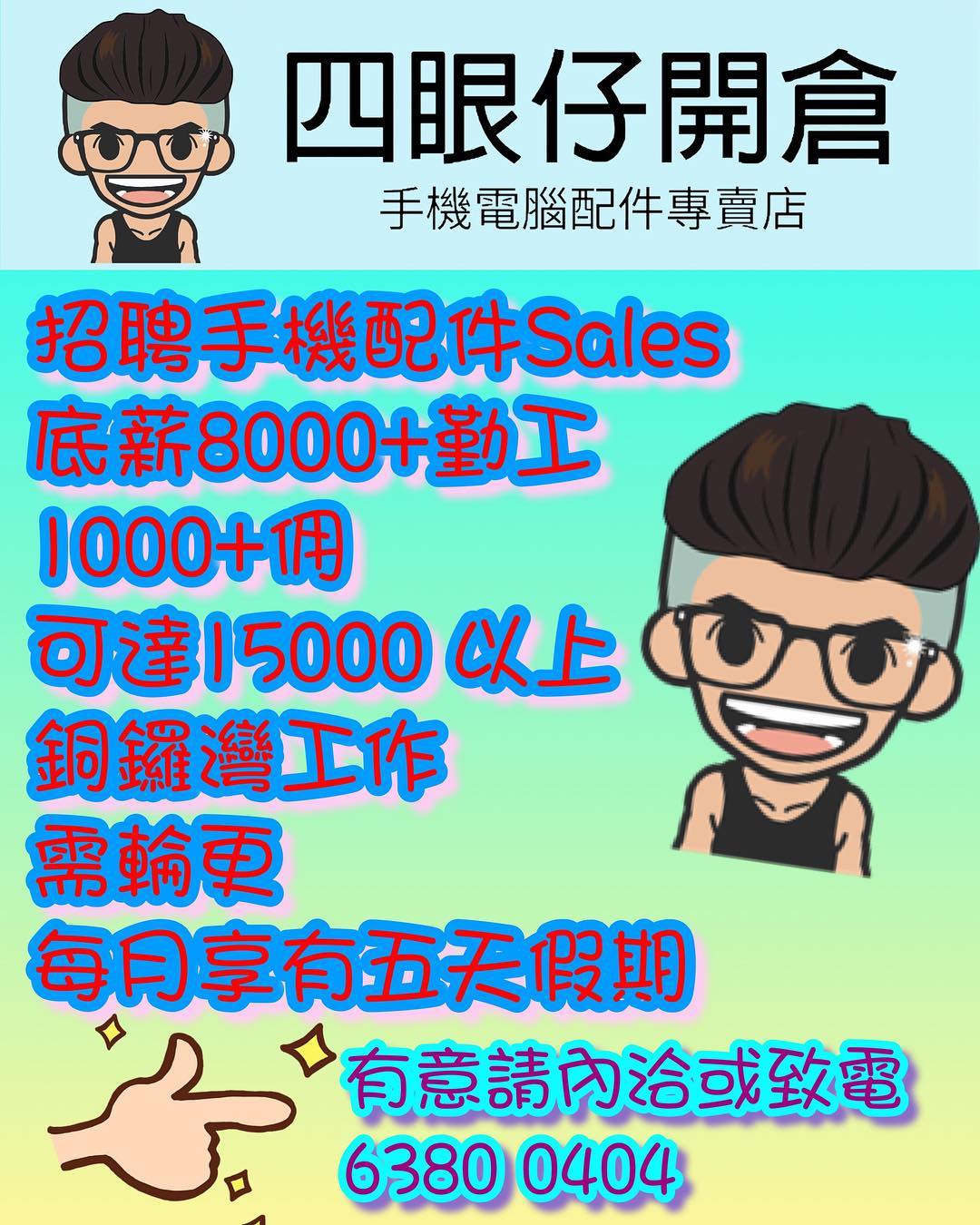 Recruiting mobile phone accessories sales, base salary 8000+ part-time, 1000+ commission up to 15000+, work in Causeway Bay, shift work required, five days off per month. Interested please contact us or call 6380 0404
