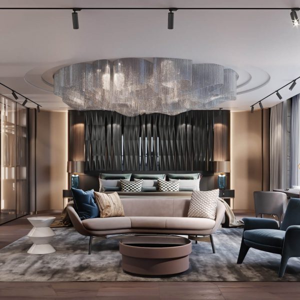 單位客飯廳較長,令陽光未能穿透整個空間,設計師特別利用燈槽,一方面平衡光線,另一方面營造簡潔風格。為免單位過分單調,設計師透過運用冷色作為主調,並配上強烈色彩的設計師傢俱,貫設出時尚型格的一面。